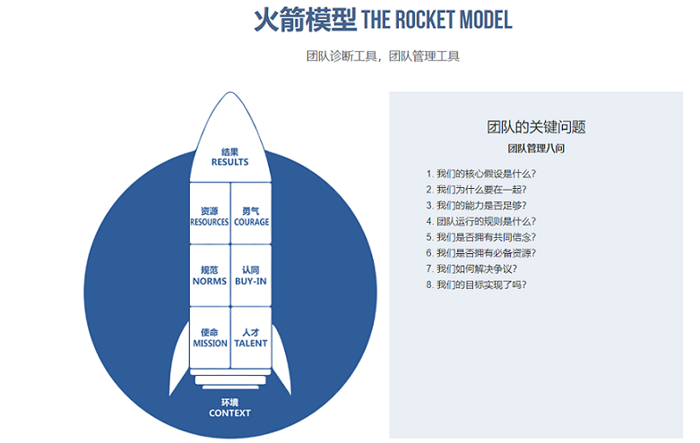 火箭模型是基于超過20年關于組織和團隊的科學調研和實踐經驗,由領導力專家GORDON CURPHY 博士和心理學專家ROBERT HOGAN博士共同研發,專注于團隊診斷與團隊效能提升的一套理論框架和實踐工具。