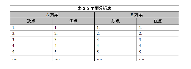 T型分析表中的“缺點(diǎn)、優(yōu)點(diǎn)、好處、壞處”等欄中應(yīng)盡可能多地列出相應(yīng)的答案,確保你對(duì)該問題的思考能保持足夠的深度與廣度。