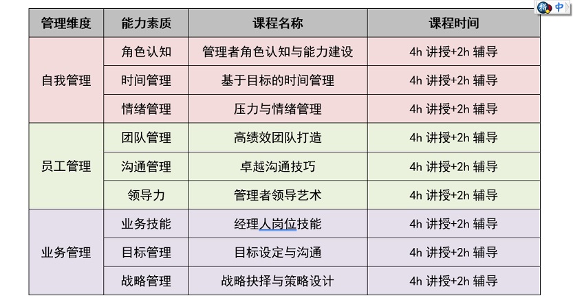 2、課程設置中高層管理者培訓集中在“自我管理”、“員工管理”、“業務管理”三個維度,每個管理維度都有相對應的能力素質模塊,據此設置針對性課程,具體見表1-3。