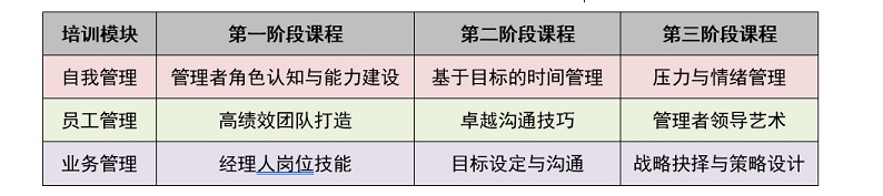 本培訓方案的課程設計分三個模塊,每個模塊又分為三個階段,進行進階培訓。課程安排可根據公司具體情況進行個性化調整,既可以三個模塊同步進行,也可以分模塊進階。每門課程時間為1天,其中《卓越溝通技巧》和《管理者領導藝術》課程可以根據公司需要調整為兩天;《高績效團隊打造》課程可以根據公司需要單獨設計績效相關課程,分開講授;預計培訓總時間為9-12天。大致的課程安排見表1-4。